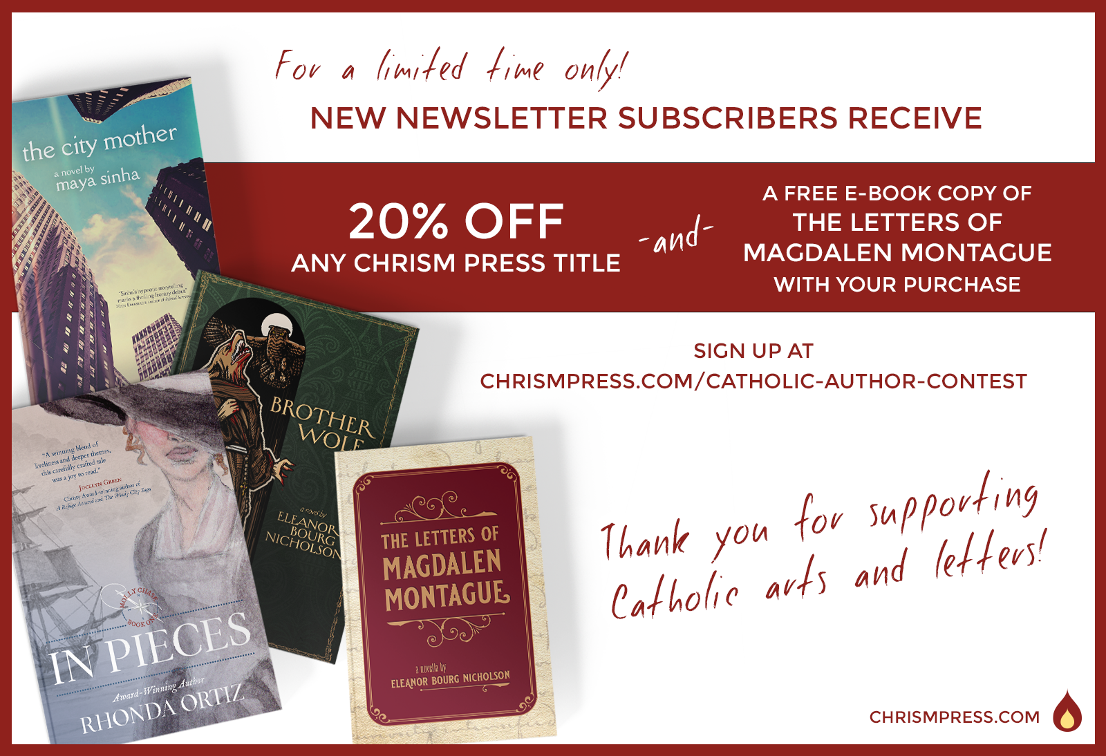 Thank you for your interest in CatholicAuthor.us and Chrism Press. Sign up below for the Chrism Press newsletter and receive a coupon code for 20% off Chrism Press titles at READ, WhiteFire Publishing’s online bookstore. PLUS you will receive a free e-book copy of The Letters of Magdalen Montague by Eleanor Bourg Nicholson with your purchase!