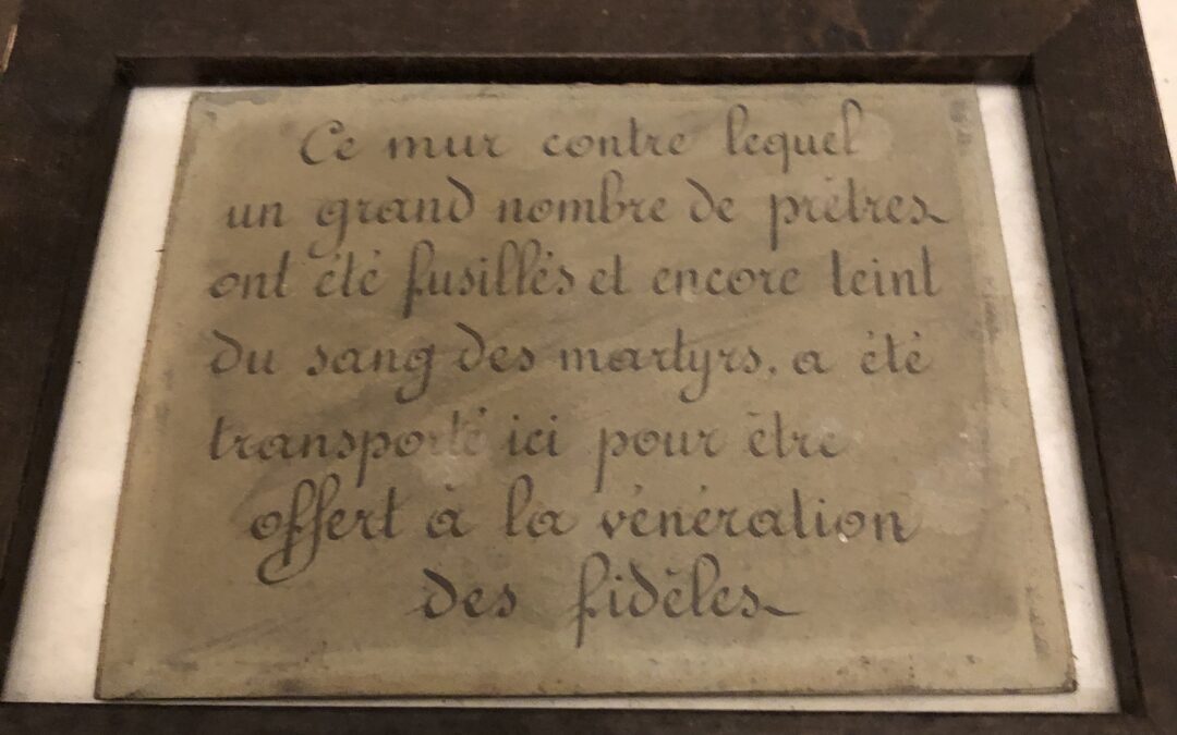 “This wall against which a great number of priests were killed, and still stained with the blood of the martyrs, has been transported here to be offered for the veneration of the faithful.”